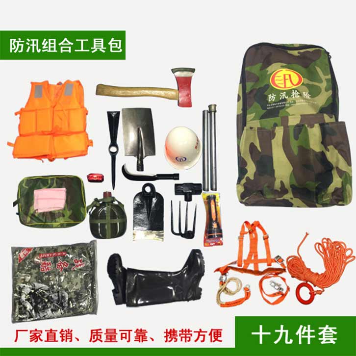 防汛組合工具包19件套:鎬、鈀、鋤頭、十磅錘、砍刀、方鏟、電筒、水鞋、防汛戰(zhàn)斗服、防寒雨衣、救生繩、雙背帶、救生衣、毛巾、水壺、頭盔、消防斧頭、信號燈、工具包。該組合工具包輕便、工具配備齊全適用于救援隊(duì)員使用。