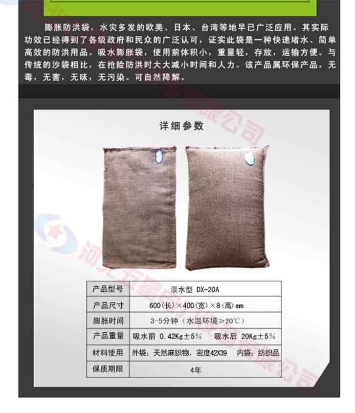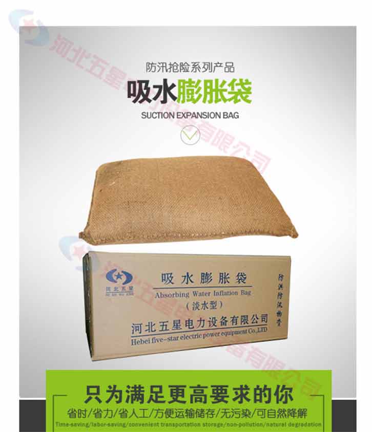膨脹防洪袋,使用前體積小,重量輕,存放,運輸方便。與傳統(tǒng)的沙袋相比,在搶險防洪時大大減小時間和人力,另防洪搶險更有效率。吸水膨脹袋屬環(huán)保產品,無毒,無害,無味,無污染。可自然降解。